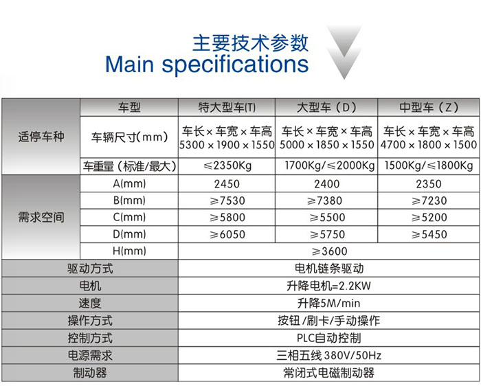 该设备充分利用空间,一个车位能停两辆车。上面层载车板可上下升降:地面层无载车板,地面层车开出后,上方的载车板下降到地面层,完成存取过程。